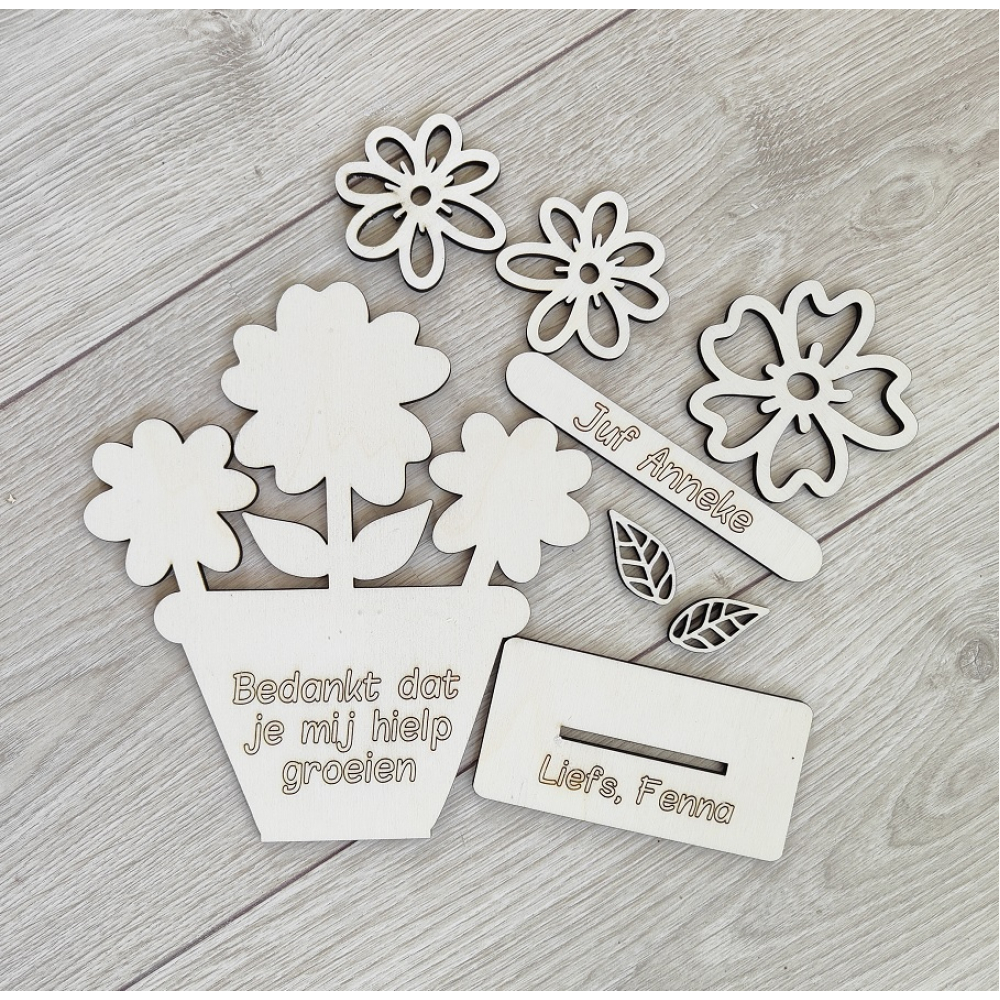 Geef de juf of meester een gepersonaliseerde en zelf geknutselde bloempot met bloemen!