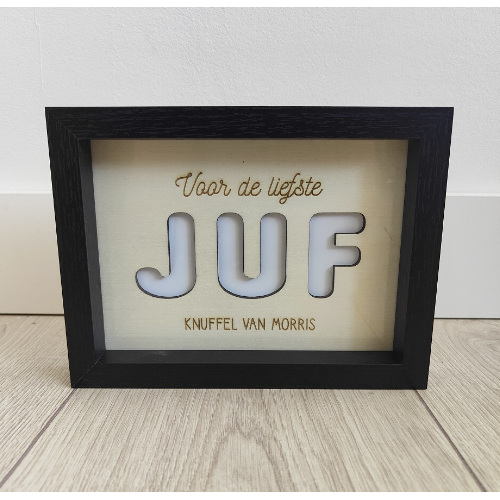 Kleur een vel met allerlei leuke kleuren en stop deze achter de letters voor een kleurrijk geheel, of doe er foto's achter van jou en de juf!