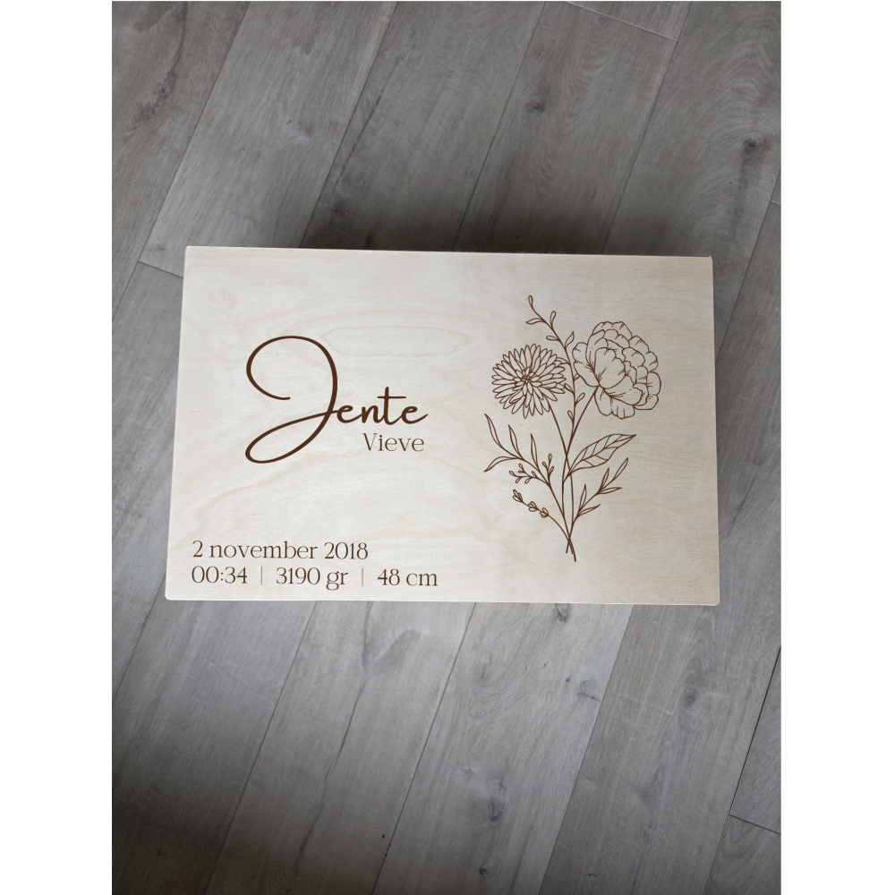 Elke kist vertelt een eigen verhaal: van geboortegegevens tot symbolen die passen bij het kindje.