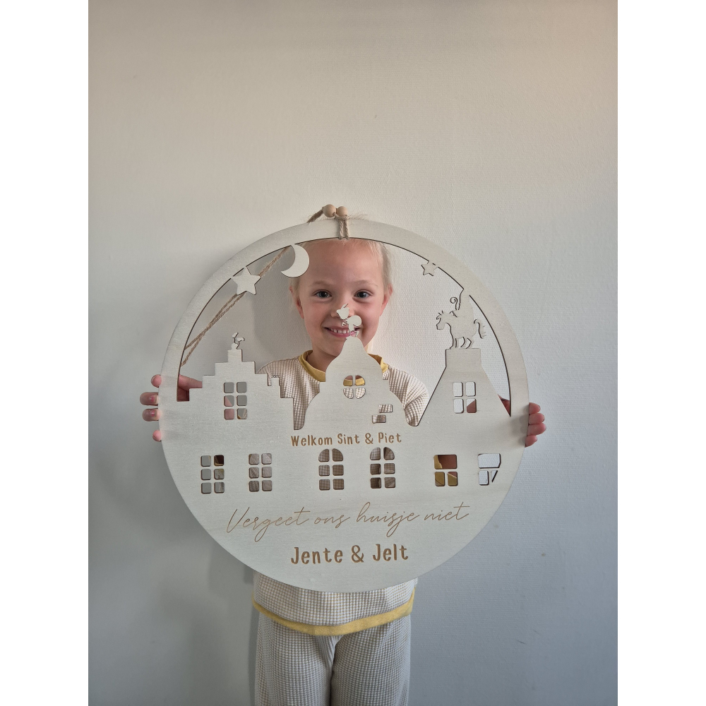 Breng de feestelijke sfeer van Sinterklaas in uw huis met deze prachtige houten cirkel van 40 cm, versierd met een vrolijke afbeelding van Sinterklaas en zijn Piet. Deze stijlvolle decoratie is perfect om uw huis een warm welkom te geven tijdens het Sinterklaas-seizoen.
