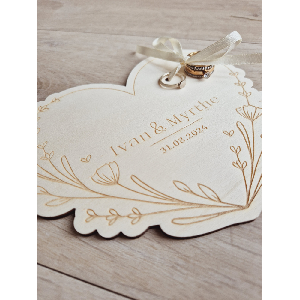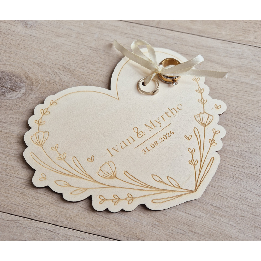 Dit prachtige exemplaar is perfect voor het presenteren van jullie trouwringen op jullie speciale dag. Het harvormige plankje is gemaakt van 4mm dik hout en heeft een elegante uitstraling die perfect past bij een romantische bruiloft.