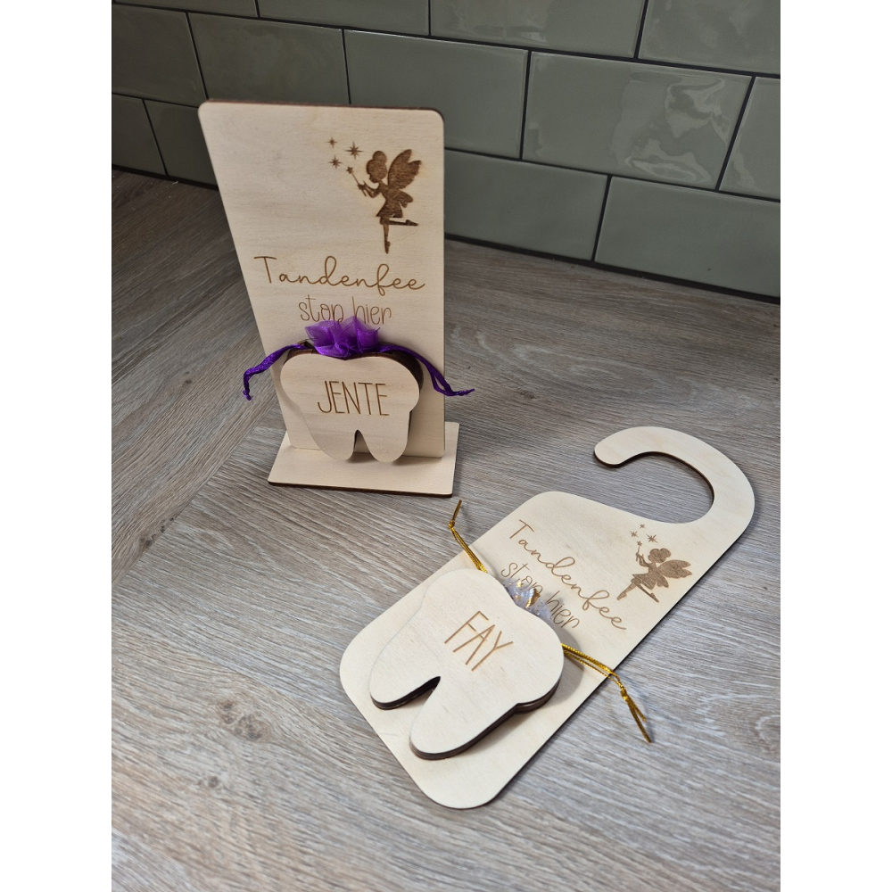 De tandenfee houten hanger/standaard is perfect voor kinderen die hun melktandjes verliezen. De hanger/standaard is gemaakt van hout. Bij de hanger/standaard krijg je een zakje waarin kinderen hun losse tandje kunnen stoppen voor de tandenfee. De tandenfee komt 's nachts langs om het tandje op te halen en een kleine verrassing achter te laten voor je kindje!