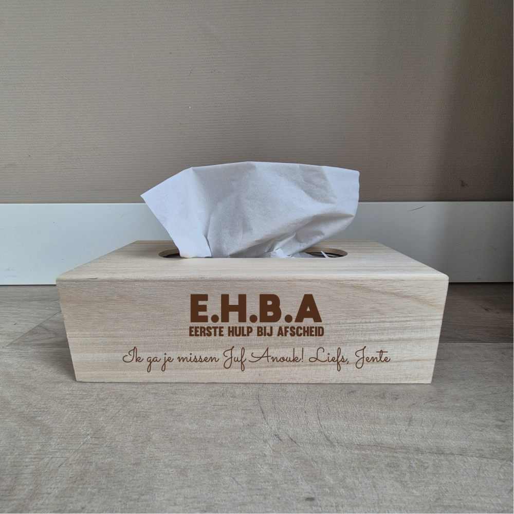 Ontdek deze prachtige houten tissuebox, perfect als persoonlijk afscheidscadeau voor de juf. Deze stijlvolle tissuebox is niet alleen functioneel, maar ook een mooie decoratie voor in huis of op het werk. Ideaal om haar te bedanken voor haar inzet en zorg. De tissuebox is voorzien van een gepersonaliseerde inscriptie, waardoor het een uniek en blijvend aandenken wordt. Daarnaast is de box handig in gebruik en geschikt voor tissues bij eerste hulp of gewoon voor dagelijks gebruik. Geef een attent en praktisch afscheidscadeau dat altijd gewaardeerd wordt!