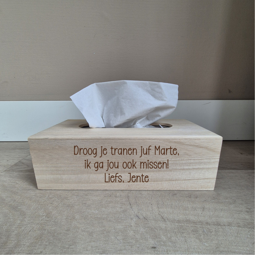 Ontdek deze unieke tissuebox van hout, perfect als gepersonaliseerd afscheidscadeau voor je juf. Deze stijlvolle tissuebox is niet alleen functioneel om haar tranen droog te houden, maar ook een mooie herinnering aan het afscheid. Een persoonlijk cadeau dat haar laat weten hoeveel ze voor jou betekent. Een prachtig aandenken om haar te bedanken en haar succes te wensen!